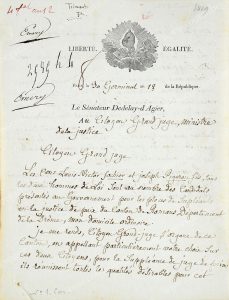 Egalité, datée du 30 Germinal de l'an XII, Paris, adressée au Citoyen Grand Juge, Ministre de la Justice, 2 pages, in-4°. Petite déchirure et humidité mais bon état général. On y joint une notice biographique sur le comte Dedelay d'Agier rédigée par le vicomte de Beauchesne, 1 page, in-4°.