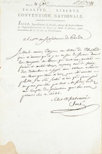 l'An II, Paris, adressée à l'administration des subsistances de Paris, 1 page, in-2¡. Lettre portée avec inscription manuscrite du destinataire au dos du documentet traces de cachet de cire rouge. Pliures, déchirures mais bon état.