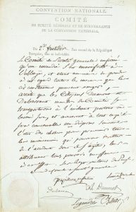 Comité de Sureté Générale et de Surveillance de la Convention Nationale, datée du 2 Fructidor de l'An II, 1 page, in-2¡, avec signatures autographes de plusieurs membres dudit Comité dont Legendre, Dubarras, Dumont, etc. comportant un cachet à froid du Comité de Séreté Générale de la Convention. Traces d'humidité et pliures mais bon état.