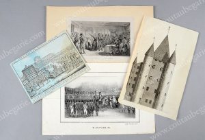 LOUIS XVI ET SA FAMILLE. Ensemble de cinq gravures et lithographies anciennes, représentant: La vue du champ de Mars en juillet 1789, La prison de la Tour du Temple, La fédération, L'arrivée du roi Louis XVI devant l'échafaud, le 21 janvier...