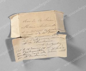 MARIE-ANTOINETTE, reine de France. Fragment de tissu, provenant d'un bas porté par la reine, conservé dans une enveloppe portant l'inscription manuscrite suivante: Bas de la reine Marie-Antoinette. Le 17 mai 1878, ce précieux souvenir m'a été...