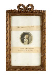 Restauration. Petits accidents au cadre, mais bon état général. A vue: Diam.: 5, 5 cm. Cadre: H.: 27 cm L.: 16 cm.