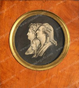 *ECOLE FRANCAISE DU XIXe SIECLE. Portrait médaillon aux profils du roi Louis XVI, de la reine Marie-Antoinette et du Dauphin. Miniature sur papier, de forme ronde, conservée dans un cadre ancien en bois naturel. Bon état, petits accidents eu...