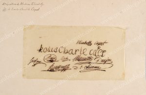 signature de Louis-Charles Capet et de celle de Madame Elisabeth (sÏur du roi Louis XVI), entourées des signatures de David, Chaumette, Pache, Daujon, etcÉ; fac-similé imprimé des signatures de Louis-Charles Capet et de sa sÏur Marie-Thérse Capet, entourées des signatures de David, Chaumette, Pache, Daujon, etc.. au bas de la déposition faite le 5 octobre 1793(ce document figure dans l'ouvrage du vicomte Alcide de Beauchesne, Louis XVII, sa vie, son agonie, en page 116); fac-similé imprimé de la signature de Louis-Charles Capet, suivie de celle de Pache, Chaumette, etc.. au bas de cette terrible déposition établie le 7 octobre 1793, accusant sa mre, la reine Marie-Antoinette d'inceste (ce document figure dans l'ouvrage du vicomte Alcide de Beauchesne, Louis XVII, sa vie, son agonie, en page 120). H.: 20 cm L.: 30 cm. bon état.