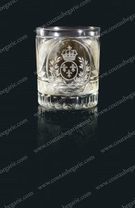 *LOUIS XVIII, roi de France. Verre commémoratif en cristal, orné d'un portrait du souverain en grisaille, entouré d'un décor de fleurs et du blason aux armes de France sous couronne royale. Usures au portrait, mais bon état général. Travail...