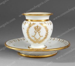 *LOUIS XVIII, roi de France SERVICE DE LA TABLE DU ROI. Petit pot à jus avec sa soucoupe, en porcelaine blanche, à décor central marqué du chiffre du roi L (Louis) sous couronne royale en lettres d'or, entouré d'une couronne de feuilles de...