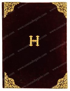 *HENRI, comte de Chambord (1820-1883). Sous-main en velours de soie couleur bordeaux, orné au centre du chiffre du prince; à chaque angle de pice ajourée, un décor de motifs d'arabesques stylisées. Intérieur en taffetas de soie moirée...