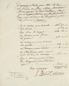 LOUIS-PHILIPPE, duc d'Orléans, dit Philippe Egalité (1747-1793). Pice manuscrite intitulée: dépense faite par M. Leleu sur l'ordre de Son Altesse Monseigneur le Duc d'Orléans É, pour l'année 1781, signée par le prince L Phil d'Orléans et...
