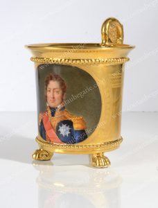 *LOUIS-PHILIPPE, roi des Franais. Tasse à café modle jasmin en porcelaine, entirement décorée d'or mat, ornée au centre d'un portrait polychrome représentant le souverain portant le ruban et l'étoile de l'ordre de la Légion d'Honneur,...