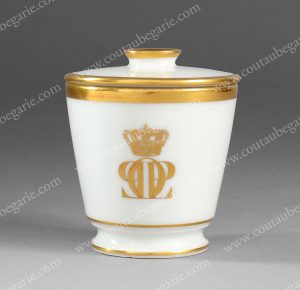 *LOUIS-PHILIPPE. SERVICE DU DUC D'ORLEANS. Pot à jus couvert, de forme évasée vers le haut, en porcelaine blanche, à décor central marqué du chiffre de L.P.O. (Louis Philippe Orléans) sous couronne royale en lettres d'or. Bon état. Travail...