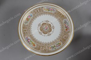 *COUPE DE PRESENTATION. En porcelaine blanche, à décor de bouquets de fleurs polychromes encadrés de frises et d'arabesques dorées, reposant sur une base circulaire. Bon état. Travail Franais de la fin du XIXe sicle, dans le goét du service...