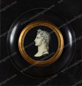 *LENOIR A. - ECOLE FRANCAISE DU XXe SIECLE. L'empereur Napoléon Ier et son épouse l'impératrice Joséphine, représentés en bustes à l'antique. Paire de miniatures sur ivoire en grisaille. Signées sous le buste : A. Lenoir. Miniature: Diam. :...