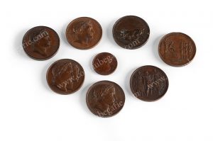 des profils de Napoléon Ier et Marie-Louise d'Autriche et d'une représentation du mariage de Napoléon Ier et Marie-Louise d'Autriche en 1810 sur l'autre, signée Andrieu; ornée sur une face du profil de Napoléon Ier et d'une représentation allégorique de la conqute de l'Illyrie sur l'autre, signée Depaulis; ornée sur une face du profil de Napoléon Ier et d'une représentation allégorique du Sénat et du Peuple sur l'autre, signée Andrieu; ornée sur une face du profil de Napoléon Ier et d'une représentation du tombeau de Desaix au mont St-Bernard, signée Droz; ornée sur une face d'une représentation allégorique de Hanovre occupé par l'armée Franaise d'une part, et du traité d'Amiens rompu par l'Angleterre sur l'autre, signée par Jeuffroy; ornée d'une représentation allégorique du traité de Presbourg rompu par l'Autriche d'une part, et d'une représentation de la bataille d'Abensberg de l'autre, signée Brenet; ornée sur une face d'une représentation allégorique de l'honneur légionnaire aux braves de l'armée d'une part, et du serment de l'armée d'Angleterre à Napoléon de l'autre, signée Jeuffroy. L'ensemble en bon état.