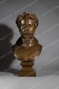 *LEQUIEN Alexandre (1822-1905). L'empereur Napoléon III couronné en César. Buste en bronze à patine médaille à nuance dorée, signé sur le côté droit et daté 1867. Reposant sur un socle carré, marqué sur la face avant N III. Bon état....