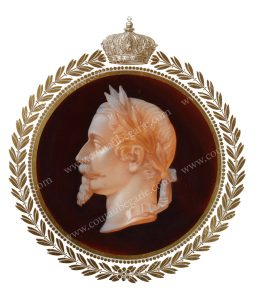 représentant l'empereur Napoléon III en César, l'impératrice Eugénie et le prince impérial, à la manire des camées antiques dans un encadrement de feuilles de laurier, surmonté de la couronne impériale. Petits manques, cheveux, pied recollé, mais bon état dans l'ensemble. Manufacture impériale de Svres, commande de la Maison de l'Empereur pour le service des dons et secours, marque verte S67 et marque rouge N sous couronne datée 1868. Ce modle est de Jules Constant Peyre, tandis que les médaillons et le décor ont été peints par Joseph Richard. H.: 14 cm D.: 21 cm.