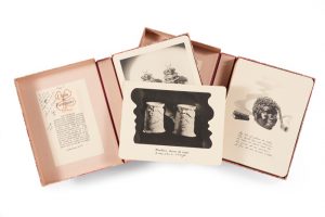 Photographies de Victor Grandpierre. S.l., s.d. (1946). 2 volumes in-4 ; en feuilles sous 2 emboîtages de papier marbré. Edition originale et premier tirage des 60 belles photographies originales tirées sur bristol ivoire. Ce livre exceptionnel est le fruit de la collaboration de Louise de Vilmorin avec le décorateur et antiquaire Victor Grandpierre. Le texte manuscrit des poèmes est reproduit en fac-simile en marge de chaque planche. Lanterne magique, pots à tabac, accessoires de couture, objets macabres, sceaux, sujets en porcelaine, découpages et images pieuses, bustes... ces objets provenant de la collection de l’auteur sont scénographiés et éclairés avec une objectivité poétique qui en révèle l’insolite, le mystère et le caractère surréaliste. Tirage limité à 225 exemplaires numérotés. Envoi.
