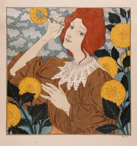 Panneau décoratif. Femme rousse aux fleurs jaunes. Monogramme E.G. dans la planche et timbres à sec. Contresigné dans la marge inférieure. 74 x 74 cm.