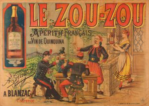 Le ZOU-ZOU. Apéritif au quinquina. A. Guillot à Blanzac (Charente). Imp. Pichot, à Paris, 115 x 158 cm. contrecollée sur panneau de bois. Féfauts au collage.