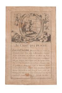 Pièce imprimée destinée à faire connaître un commerce d’épicerie et de droguerie, à l’enseigne ‘’Au Chat qui pesche ‘’. Une page in-4, présentant en haut du texte une grande vignette montrant un chat pêchant au bord d’un plan d’eau dans un encadrement d’attributs commerciaux.