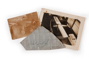 Pionnier de l’aviation célèbre pour avoir traversé l’Atlantique. Morceau de toile du Spirit of St-Louis avec signature autographe. Signature autographe « Ch Lindberh » sur un morceau de toile grise de son avion le Spirit of St-Louis. Joint 2 photographie représentant Spirit of St-Louis dans un hangar et modèle de toile qui a servi au rentoilage de l’avion. Le fuselage avait été rentoilé dans un hangar du Bourget par la Compagnie internat. de navigation aérienne en mai 1927.