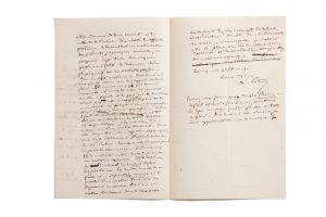 Pasteur lui envoie une note détaillé sur son parcours universitaire avant de résumer ses travaux de chimie moléculaire, pour la Revue de Drion; (…) Ce qui distingue ces travaux indépendamment de leurs résultats, c’est la méthode de l’auteur. Il a abordé les difficiles problèmes de la constitution moléculaire des produits organiques naturels, en joignant (…) les ressources de la physique et de la cristallographie (…). Or Mr Pasteur a reconnu que la forme de tous les produits naturels, c’est-à-dire qui ont été élaborés sous d’influence de la vie végétale est dissymétrique à la manière d’une main ou d’un escalier tourneur (…). Il estime que ces particules élémentaires ne sont pas une condition nécessaire de l’existence de la molécule. On peut la faire disparaitre ou la rendre inverse de ce qu’elle est (…). Un des points les plus intéressants des recherches de Mr Pasteur consiste dans la découverte des relations si remarquables qui existent entre le phénomène de la polarisation rotatoire et la constitution dissymétrique des molécules organiques (…).