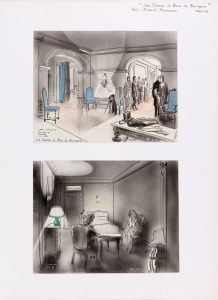 Réalisation : Drame de Robert BRESSON. Scénario et dialogues : Robert Bresson (dialogues de Jean Cocteau), d’après un épisode de Jacques le Fataliste de Diderot. Photographie : Philippe Agostini. Décors : Max Douy. Distribution : Maria Casarès, Paul Bernard, Elina Labourdette, Jean Marchat, Lucienne Bogaert. - Dessin au fusain, 38 x 52 cm. 2 Dessins au lavis avec rehauts de couleur.