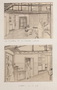 Réalisation : Film policier, version réalisée par Henri AISNER. Scénario et dialogues : Vladimir Pozner, d’après le roman de Gaston Leroux. Distribution : Lucien Nat, Serge Reggiani, Pierre Renoir, Hélène Perdrière, Marcel Herrand. - 17 Dessins au crayon sur papier calque. 24 x 32 cm (environ. Joint, divers croquis sur papier.