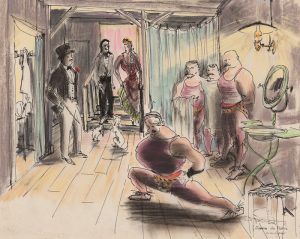 Réalisation : Comédie de Jean RENOIR. Scénario et dialogues : Jean Renoir, d’après une idée de André-Paul Antoine. Photographie : Michel Kelber. Distribution : Jean Gabin, Françoise Arnoul, Maria Félix, Jean-Roger Caussimon, Gianni Esposito- 10 Dessins à la Gouache, pastel ou aquarelle sur papier ou carton, représentant des scènes et décors du film. 26 x 31 cm à 50 x 65 cm. En majorité signés. - 15 Dessins sur calques avec rehauts de pastel ou gouache, contrecollés sur papier représentant principalement des scènes du film. 37 x 61,5 cm à 52,5 x 84 cm. En majorité signés. - 17 Calques certains avec rehauts de couleur, représentant des scènes du film ou des plans. 19 x 24,5 à 57 x 81 cm. - Environ 75 photographies représentant des scènes du film ou des plans de tournage. Joint, un ensemble de photographies de maquettes et de plans. - Un ensemble de tirages de plans imprimés.