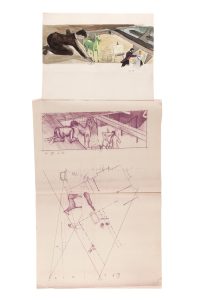 Réalisation : Claude AUTANT-LARA. Scénario : Jean Aurenche et Pierre Bost, d’après le roman de Marcel Aymé. Photographie : Jacques Natteau. Décors : Max Douy assisté de Jacques Douy. Distribution : Bourvil, Yves Robert, Francis Blanche, Sandra Milo, Julien Carette. - 9 Compositions de techniques diverses, sur papier ou sur calque. 21 x 50 cm à 55 x 74 cm. Joint, divers croquis au crayon de papier et des reproductions de documents divers.