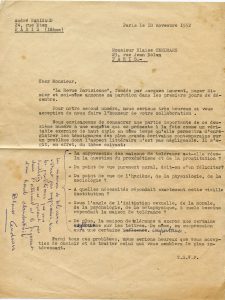 - Réponse faite par retour sur une demande d’André Parinaud {un des 3 fondateurs de «La revue Parisienne» concernant le No2 de la revue. - Lettre dactylographiée de A.Parinaud de Paris du 18/11/1952 « demande de réponse pour le No 2 de la Revue Parisienne. Nous envisageons de consacrer une partie importante à une enquête sur La suppression des maisons de tolérance a-t-elle résolu la question du proxénétisme et de la prostitution? Du point de vue purement moral, doit- on s’en féliciter ? Du point de vue de l’hygiène , de la physiologie, de la sociologie ?A quelles nécessités répondait exactement cette vieille institution ?Sous l’angle de l’initiation sexuelle, de la morale, de la psychologie, de la métaphysique, à quels besoins répondait la maison de tolérance ?De plus, la maison de tolérance a exercé une certaine influence sur les lettres. De même, sa suppression aura une certaine importance. Parmi tous ces problèmes, nous serions heureux que vous acceptiez de choisir et de traiter celui qui vous semblera le plus intéressant...Et la réponse autographe signée de Blaise Cendrars sur un coin de cette lettre «Les maisons de tolérances n’étant pas supprimés, tous les problèmes que vous soulevez ne se posent pas dans l’attrait et le piquant d’une haute clandestinité Blaise Cendrars» - Etonnante réponse !! - 2p.p in-4