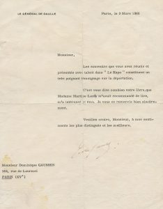 adressée à Mr Dominique Gaussen «Monsieur, Les souvenirs que vous avez réunis et présentés avec talent dans «Le Kapo» constituent un très poignant témoignage sur la déportation. C’est vous dire combien votre livre, que Madame Martine Lamy m’avait recommandé de lire, m’a intéressé et ému. Je vous en remercie bien sincèrement. Veuillez, Monsieur, à mes sentiments les plus distingués et les meilleurs. Signé «C. de Gaulle.» TTB - On joint un extrait d’un journal sur la lettre du Général de Gaulle (Dominique Gaussen avait en effet été envoyé en camp de concentration à l’âge de 20 ans) - 1 p in-4 TTB