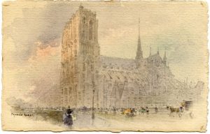 Très bel ensemble : Un catalogue 15,5 x 12,3 cm de 24 p.p d’une vente aux enchères d’aquarelles «Vues de Paris» faite à Paris le 15 mars 1898 à l’Hôtel Drouot par Me Jules Guillet commissaire-priseur & M. Cuerel Expert. Toutes les pages de ce livret sont agrémentées par une ou plusieurs aquarelles miniatures originales de Francis Garat . Aquarelle sur une CARTE POSTALE de 9,5 x 14,7 cm de la Cathédrale de Paris, coté Seine et signée & au verso texte autographe signé «Mademoiselle, Recevez les vœux d’un vieil aquarelliste et plaignez le de choisir pour modèle une merveille qu’il ne pourra jamais interpréter fr Garat» Carte de visite de Francis Garat 8, rue Pierre-Ginier, 18e rehaussée d’une aquarelle «pécheurs sur les bords de la Seine» avec ses mots au crayon «désirerait dire deux mots à monsieur Milès» - SUP