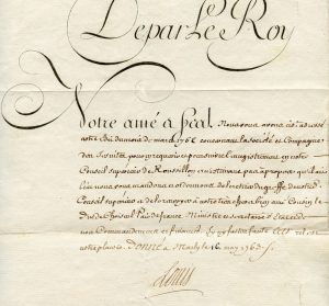 «De par le Roy/Notre aimé a Feal Nous vous avons adressé notre Edit du mois de mars 1762 concernant la société et compagnie des Jesuites pour en requérir et poursuivre l’enregistrement en notre Conseil supérieure de Roussillon et n’estimant pas à propos qu’il ait lieu nous vous mandons et ordonnons de le retirer du greffe de notre Conseil supérieur et de le renvoyer à notre très cher et bien aimé Cousin le Duc de Choiseul Pair de France Ministre et secrétaire d’Etat et de ...Donné à Marly le 16 mai 1763. Signature secrétaire «Louis» 1 page in-fol – SUP