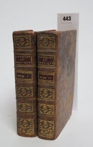 2 volumes in 12 reliés en plein veau, reliure d'époque, dos à nerfs ornés de fleurons dorés, pièces de titres et de tomaisons en maroquin rouge, tranches rouges. Quelques épidermures sur les plats avec petits manques de cuir par endroits ; la coiffe du tome 1 est abîmée. Ouvrage collationné et complet du texte et des 14 planches. Le tome 1 contient 11 planches dont 2 cartes dépliantes, 7 planches dépliantes et 2 planches simples. Le tome 2 contient 3 planches dépliantes. Intérieurs propres malgré une mouillure sur les 23 premiers feuillets du tome 2 et une galerie de vers assez prononcée de la page 434 à 482.