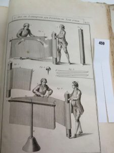 4 volumes in-folio, reliés en demi-basane marron clair, dos à nerfs, reliure d'époque. Plats recouverts de papier marbré. Pièces de titres en maroquin rouge, disposées en long dans les caissons. Reliure très modeste en mauvais état, trous de vers, mors fendus, manque de cuir, épidermures, cuir sec... description valable pour les 4 volumes. Ouvrage à toutes marges non rognées. Nous présentons : 1 volume intitulé : 3ème et 4ème sections 1773 ; la pagination de l’ouvrage est continue, donc ce volume commence à la page 132 et fini à la page 211 suivi de 16 planches dont 2 dépliantes. Galerie de vers au début de l'ouvrage, avec perte de mots, finissant en trou vertical jusqu'aux planches incluses. Trou en marge basse (avec tournevis, poinçon ?) allant de la fin au milieu de l'ouvrage. 1 volume intitulé : cinquième section, 1774 commençant à la page 313 et finissant à la page 399 plus 12 planches. Bon état intérieur. 1 volume intitulé : sixième section, 1775, IV pp. puis un feuillet 395/396 puis manque les feuillets 397 à 402, reprend à la page 403 pour finir à la page 639 puis 37 planches. Bon état intérieur. 1 volume intitulé : septième section, 1777, pagination allant de 337 à 544, erreur de foliotage, pas de manque de feuillet. Puis 24 planches, dont 1 dépliante, numérotées de 34 à 57. Bon état intérieur. D'après mes recherches, l'ouvrage est composé de 9 sections ; les 89 planches présentes dans ces 4 volumes sont techniques mais on peut voir aussi des personnages au travail de la soie. Superbe travail du dessinateur et du graveur. Série incomplète mais d'une grande rareté.