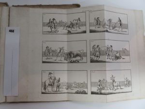 1 volume in-4° en cartonnage d’attente complètement défraichi, dos arraché, mouillure en angle, importante au début et s’amenuisant in-fine. Exemplaire modeste mais complet des XIV planches, la plupart dépliantes, des cartes, plans, vues de châteaux, et de 2 belles planches comprenant douze vignettes montrant les passes de tauromachie.