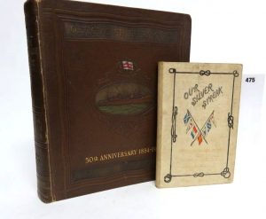 1 fort volume in-4° en cartonnage éditeur, pleine percaline marron avec un bateau en relief sur le premier plat et titre doré. Légère usure le long des mors. Bel exemplaire, nombreuses cartes en couleurs, reproductions de photos en noir et blanc; Le second volume, d’Arthur Underhill : « Our silver streak, or the Yachtsman’s guide from Harwich to Scilly». A Londres, chez Norie & Wilson, s.d. (circa 1890). 1 volume in-8° en cartonnage éditeur, peine percaline crème, avec drapeaux polychromes sur le premier plat et « corde » noire en encadrement. 5 plans dépliants et quelques croquis. Pas de rousseur à l'intérieur, quelques unes sur la percaline.
