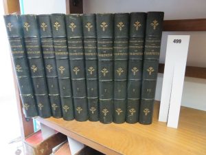 10 volumes in-8°, reliure d’époque en demi-chagrin vert, dos à nerfs ornés avec titre et auteur dorés. Frottements d’usage en particulier sur les coiffes. Corps d’ouvrage assez propre, quelques rousseurs et nombreuses annotations en marge faites au crayon.