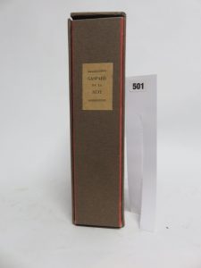 volume in-4, en feuilles sous chemise et étui recouvert de papier gris. Ouvrage tiré à 141 exemplaires ; exemplaire n°11 imprimé sur grand vélin d’Arches contenant une suite de gravures avec remarques et un dessin d’étude des illustrations. Bel exemplaire sans rousseur. La partie haute de l’étui se décolle sur un bord.