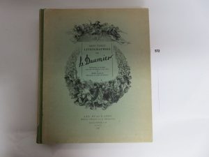 1 volume in-folio, cartonnage éditeur, premier plat illustré d’une reproduction de lithographie de Daumier. Petites mouillures au dos. Mors doublés avec de la percaline verte claire. Coins légèrement émoussés. 2f.b – f.t – t – 120 planches – 28pp. Tirage limité à 310 exemplaires, celui-ci porte le n°253. Très belle reproduction, aucune rousseur, toutes les planches sont protégées par une serpente légendée.|