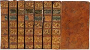 Paris, Guillaume-François De Bure le jeune, 1763 [- 1768]. 7 vol. in-8° (texte n.c., qqs rouss., cachets aux titres). Rel. de l'époque : plein veau tacheté, plats cernés d'un filet ondulé à froid, dos fleuronnés dorés à nerfs, tr. rouges (rel. +/- fortement us. et abîmées, plat sup. d'1 vol. dérelié, manquent qqs étiq. aux dos, ex-libris armoriés sur les contreplats). ÉDITION ORIGINALE de ce premier manuel français destiné aux amateurs de livres rares par le libraire et bibliographe français De Bure (Paris 1731-1782) : 3 volumes sont consacrés à l'histoire, 2 aux belles-lettres, 1 à la théologie et 1 à la jurisprudence, aux sciences et aux arts. Ouvrage réputé pour la profondeur de ses articles qui, bien que dépassé de nos jours, donne une idée des goûts bibliophiliques de l'époque.