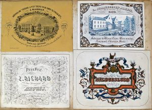 Grandeurs variées, en français sauf 2, rares sur fond de couleurs, collées en plein (ff. de support avec rouss., qqs-uns part. déreliés, avec 3 poèmes mss écrits à la suite). Dans un album in-8° oblong ad hoc : pleine percaline chagrinée noire, plats cernés de filets gras à froid, plat sup. titré doré, dos lisse (us. au dos, mors et coiffes, dos détachés, coins fort émoussés). Cartes porcelaine : hôtels et restaurants (du chemin de fer à Namur, Grand cerf à Liège, de la Porte Bleue à Brux., Au café de Paris à Mons...), métiers (négociant en vins Dris-Bosquet, maréchal-ferrant Strout, confiseur F. Stein, fabricant de billards J. Rémus frères, fabrique de chapeaux de paille Au garde forestier...), etc.-- Photos, 2 en double : vues et monuments de Bruxelles, Louvain, Audenaerde, Gand, Hastière, Dinant et Bruges.