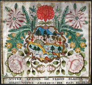 18e s. AQUARELLE ORIGINALE, +/- 27 x 29 cm, sur PEAU DE VÉLIN, légendée en français sous le champ cerné d'un large filet doré (lég. us. ou salissures sur les bords surtout). Posée sur papier noir avec commentaires mss modernes en français ou néerlandais, sous vitre. Belle grande composition. Thème central, cerné de volutes dorées, avec personnages, animaux, ville ou maison, coeurs ardents plantés dans le paysage arboré, le tout inséré dans de grandes compositions florales.
