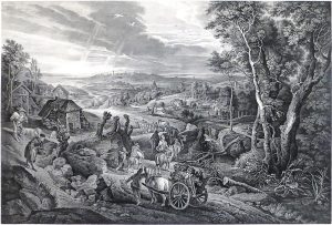 BROWNE, John (1741-1801).- Paysage valloné boisé avec paysans et voyageurs [d'après Pieter-Pauwel RUBENS (1577-1640)].