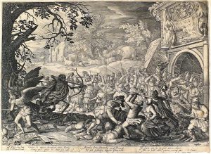 Eau-forte, 27,7 x 38,2 cm, papier vergé, collée en plein sur f. de support (rognée au-delà de la cuv., pli central, manque de papier comblé à la marge inf.). RARISSIME planche allégorique figurant la Mort menaçant les courtisans à l'avant plan et les bêtes au fond du tableau. Sujet daté 1610 accompagné de 6 vers par J. Semmius en bas de la planche : "Cernis ut imperio succumbant omnia Mortis [...]".