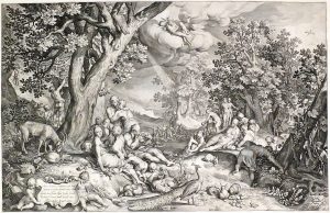 Anvers, Joannes van der Bruggen, [ 1604]. Eau-forte, TC 43,7 x 68,1 cm + bonnes marges, papier vergé non filigrané, fixée par les coins sup. sous passe-partout (trace d'un pli central vertical au verso). Deuxième état (sur 3) de cette IMPORTANTE et SUPERBE ESTAMPE donnant une évocation du paradis peuplé d'hommes, de femmes et d'enfants, de couples d'amoureux, de danseurs... et d'animaux (paons, lapins, un chèvre...), le tout dans une nature abondante.