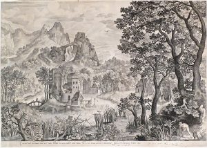 Eau-forte, cuv. 44,8 x 63,3 cm, papier vergé non filigrané, fixée par les coins sup. sous passe-partout (rognée sur la cuv.). Grand paysage aquatique alpestre avec un château et des fermes, animé de chasseurs et de voyageurs. En bas, une citation en latin d'après les "Métamorphoses" d'Ovide.