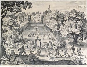Eau-forte, cuv. 41,2 x 53,8 cm, papier vergé non filigrané, fixée par les coins sup. sous passe-partout (rognée sur la cuv., faible trace d'une pliure verticale). Une de la suite de 6 estampes figurant l'histoire du fils prodigue; celle-ci avec la légende "Et venere et Baccho bona decoquit omnia natus". La scène est située dans un parc avec château et représente le protagoniste se livrant aux plaisirs du monde tandis que son frère garde les cochons.