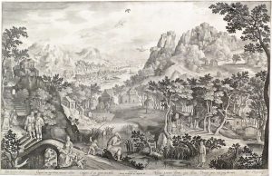 Amsterdam, François van Beusecom, [c. 1600]. Eau-forte, cuv. 43,4 x 67,8 cm, papier vergé non filigrané, fixée par les coins sup. sous passe-partout (rognée en-deçà de la cuvette). Sujet biblique situé dans un grand paysage vallonné, animé de nombreux personnages, avec vue sur un château, des fermes, un moulin à eau et une ville portuaire à l'horizon.