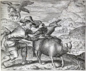 In-8° : 132 eaux-fortes, cuv. 9,4 x 11,2 cm, papier vergé non filigrané, 19 x 14 cm (qqs faibles taches brunes margin., 1 déchirure margin. avec perte (c. 1 x 6 cm) sans atteint au sujet, 1 coin déchiré idem). Rel. du 17e s. : plein vélin, dos lisse, tr. jasp. rouges (lég. défr., annot. ms. sur gardes). Curieux ensemble de sujets, aux dimensions exactes de l'édition originale mais inversés, tirés du célèbre recueil "De warachtighe fabulen der dieren" paru en 1567 (107 pl.) et en 1578 sous le titre de "Estbatement moral des animaux" (125 pl.), augmenté de quelques autres tableaux.